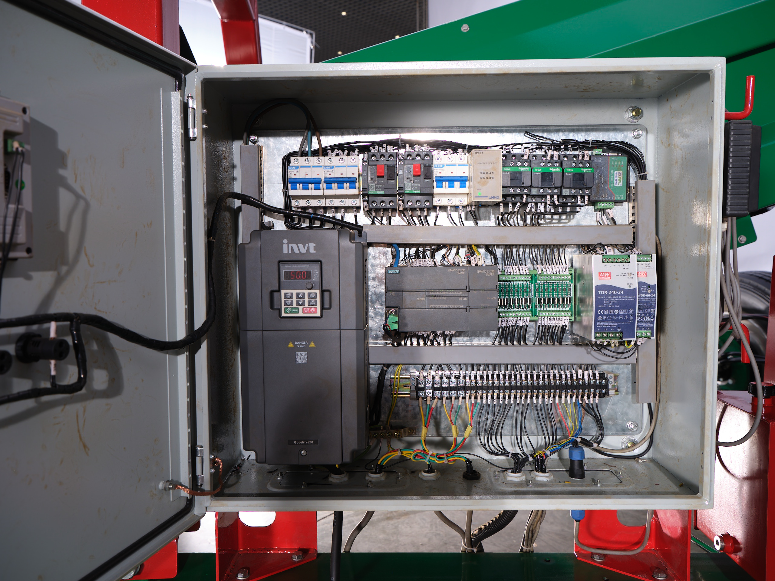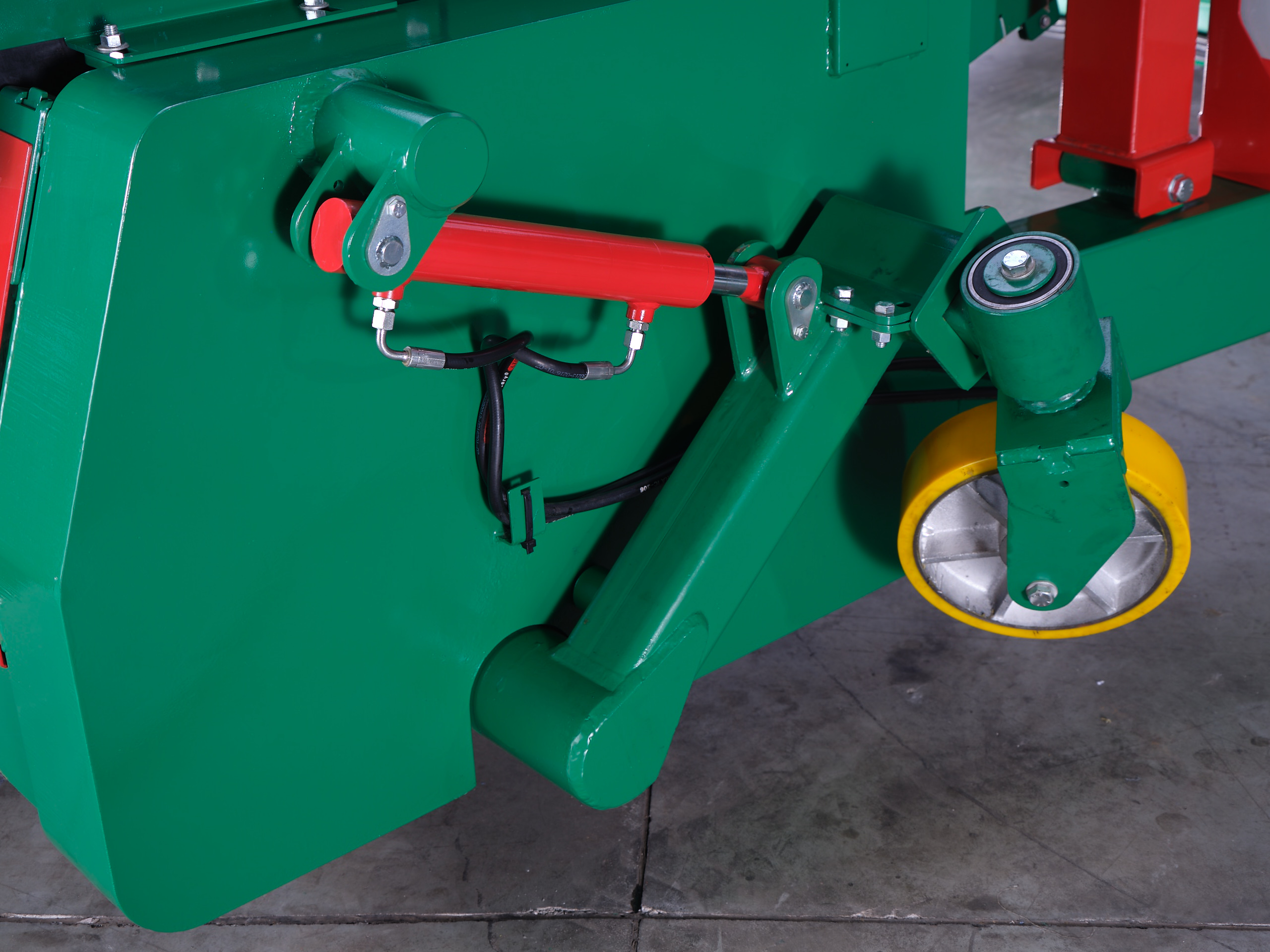 Press the green start button on the electrical box, then press the swing mode button on the operating handle to raise the small casters, bringing the