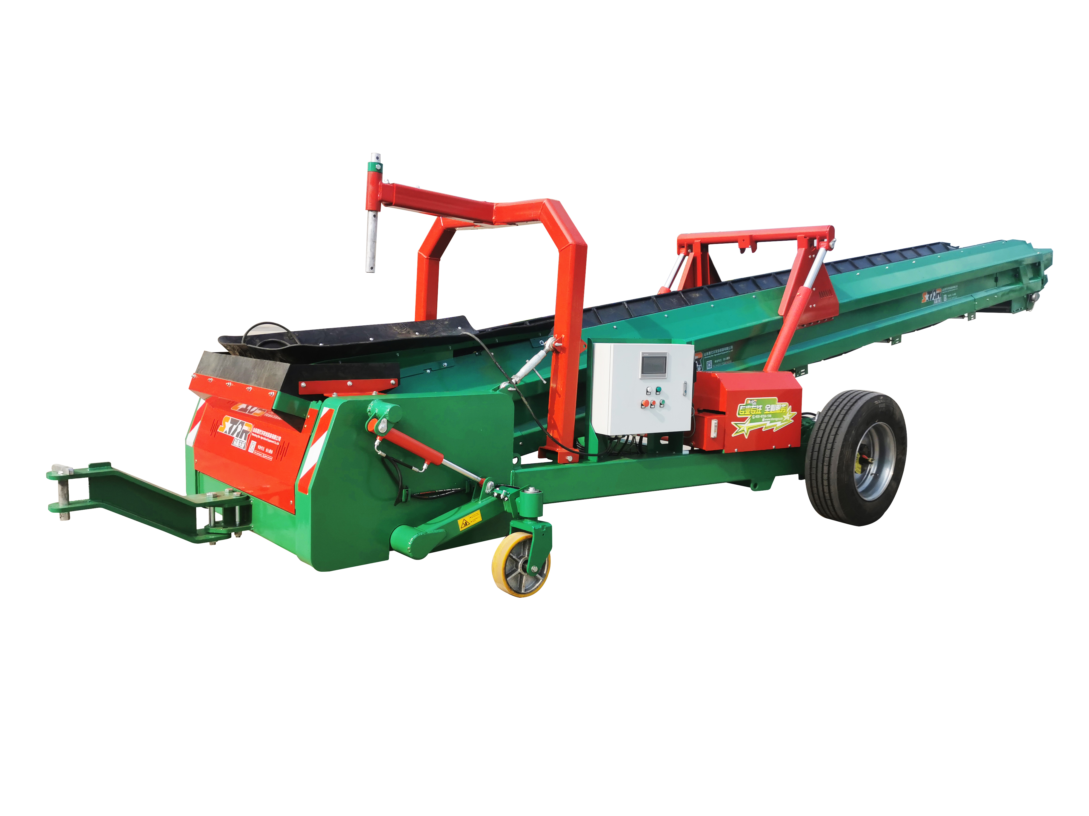 The 5SD-80 potato stacker is powered by an external AC380V power supply, which drives the hydraulic pump station and subsequently the conveyor